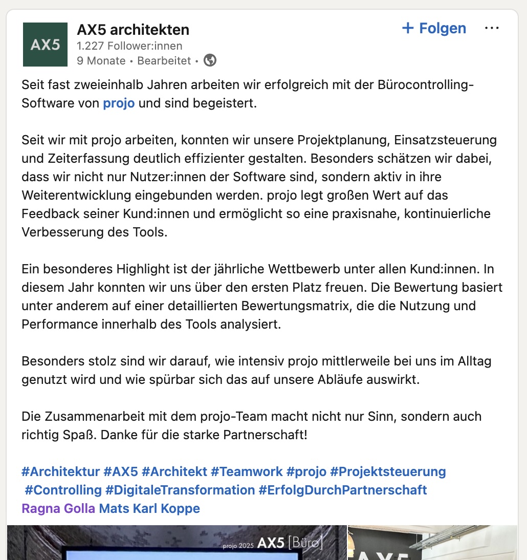 AX5: "Seit fast zweieinhalb Jahren arbeiten wir erfolgreich mit der Bürocontrolling-Software von projo und sind begeistert."