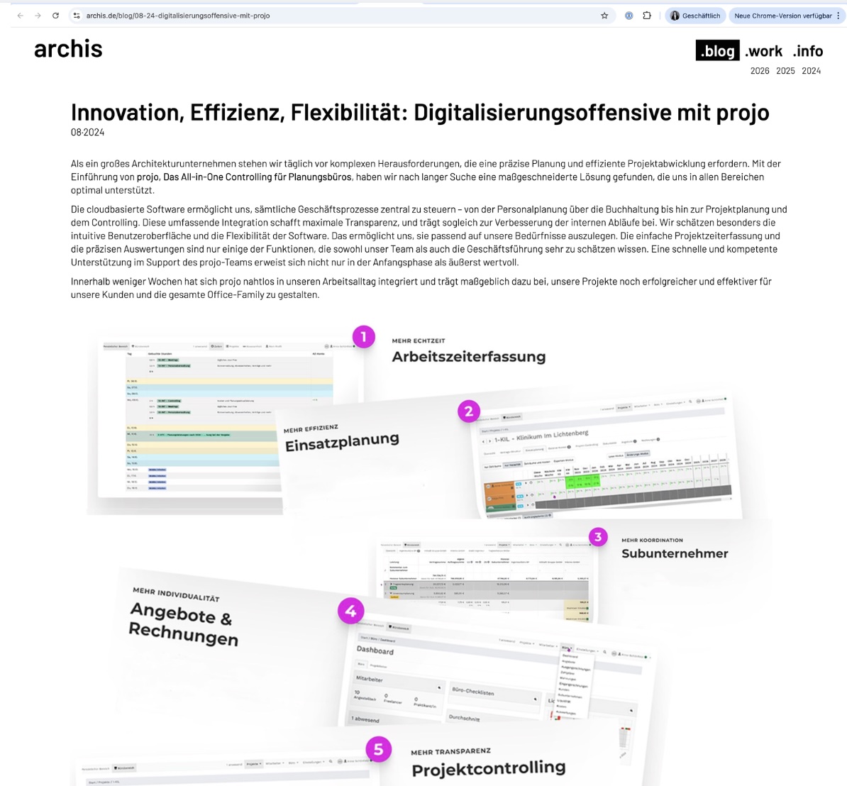 Archis: "Innerhalb weniger Wochen hat sich projo nahtlos in unseren Arbeitsalltag integriert und trägt maßgeblich dazu bei, unsere Projekte noch erfolgreicher und effektiver für unsere Kunden und die gesamte Office-Family zu gestalten."