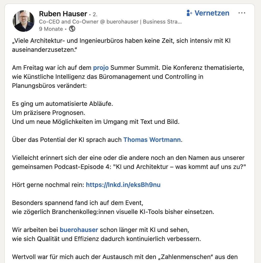 buerohauser: "Wertvoll war für mich auch der Austausch mit den „Zahlenmenschen“ aus den Büros. Oft hat man ja das Gefühl, mit seinen Herausforderungen allein dazustehen. Aber am Ende geht es allen um ähnliche Fragen [...]. Der Austausch war ehrlich und direkt. Und genau das braucht es, wenn fast jede Woche neue Tools erscheinen, die Planen und Bauen effizienter machen sollen."